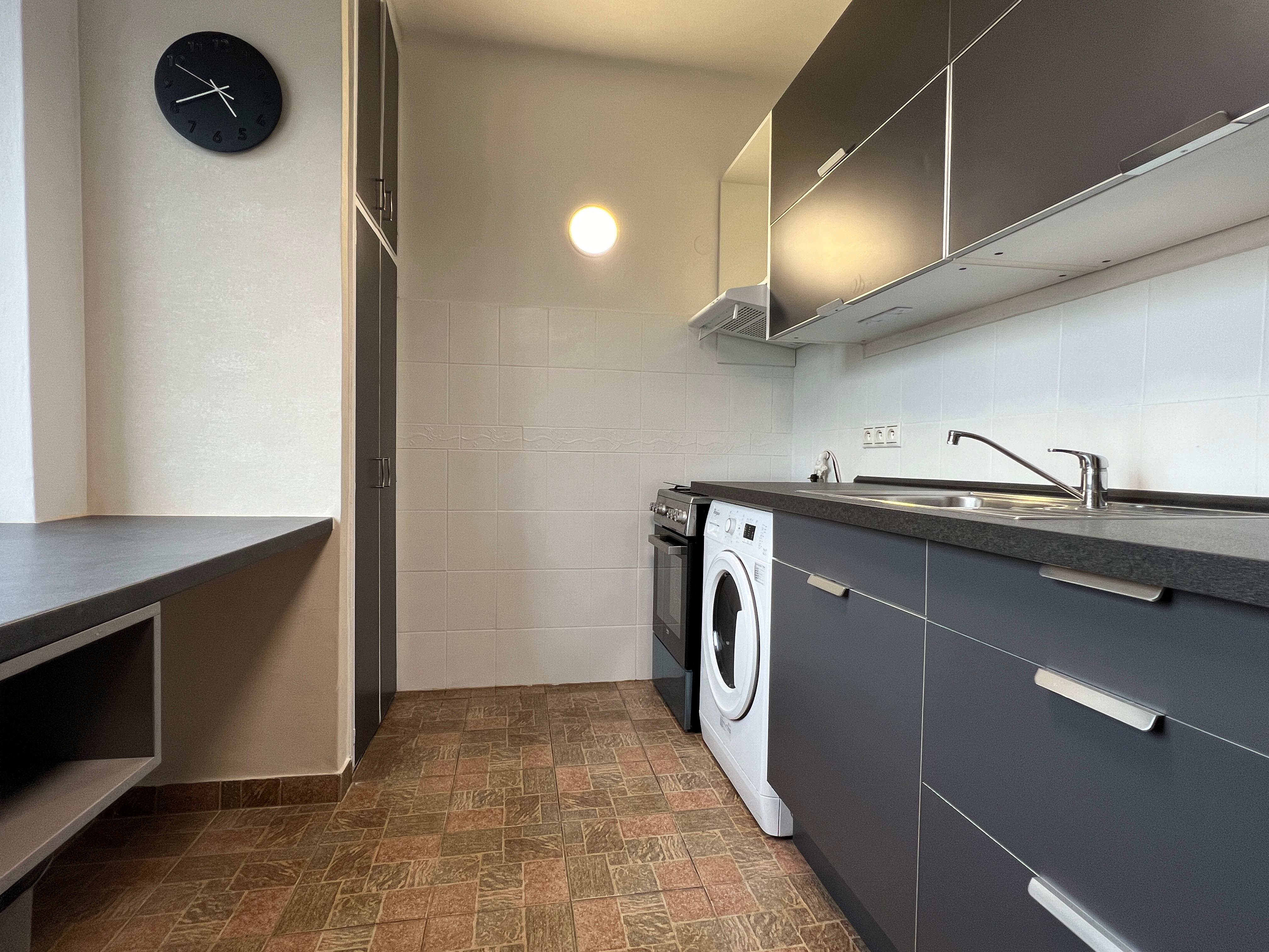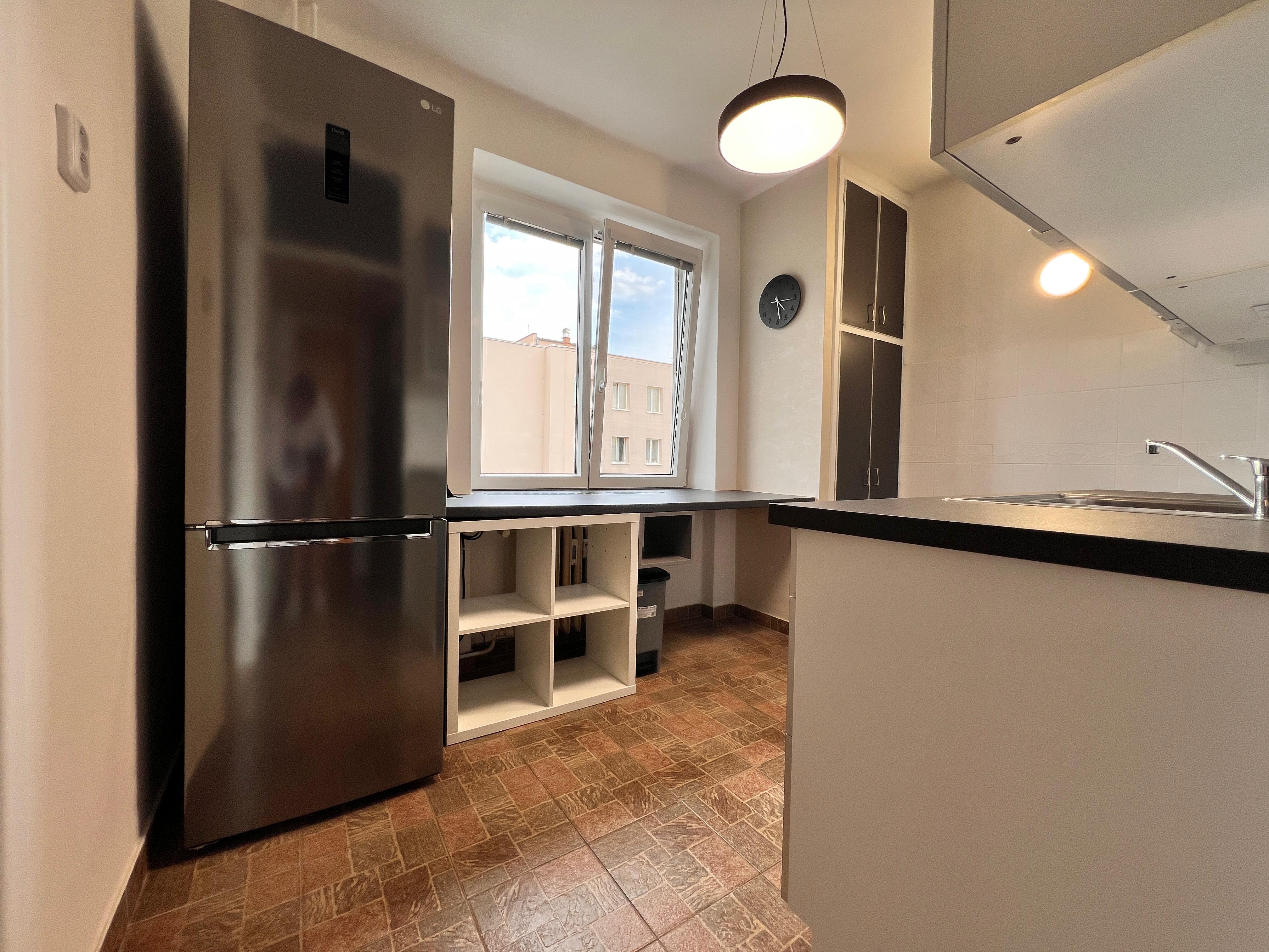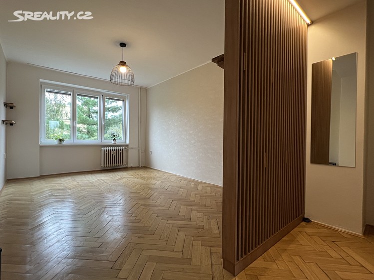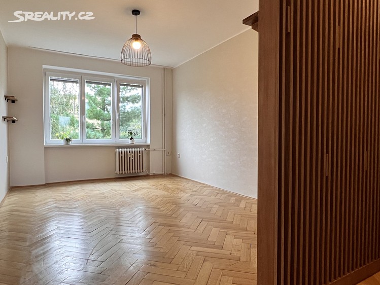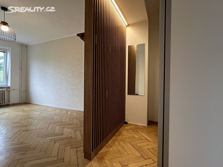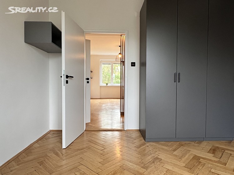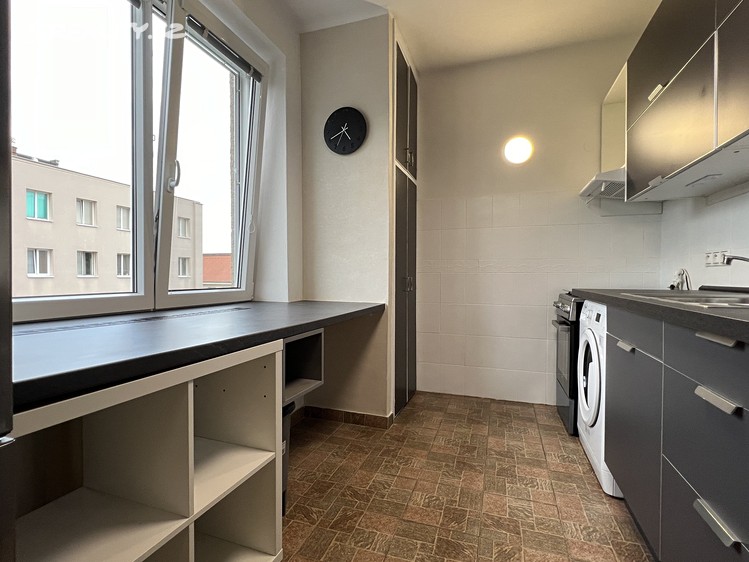 Byt se skládá z prostorné světlé předsíně, ze kterých jsou vstupy do oddělené koupelny a samostatného WC. Kuchyňský kout v šedém dekoru je vybavený moderní lednicí od značky Samsung, digestoří, plynovým sporákem s elektrickou troubou a pračkosušičkou. V kuchyni je dostatek úložného prostoru a také světla. V bytě se nachází dvě ložnice. První ložnice je situována do ulice Kafkova a je vybavenou šedou skříní. Druhý prostornější pokoj je situovaný do klidného zeleného vnitrobloku. Pokoj je přepažený dřevěnou moderní polo příčkou, která odděluju šatnu od pokoje. V tomto pokoji jsou na stěnách nataženy krémové tapety. V bytě jsou všude nové bíle dveře, čerstvě vymalováno, sítě v oknech a také okenní žaluzie. Okna v bytě jsou moderní plastová. V pokojích jsou na podlaze dřevěné parkety, ve zbytku bytu je položena dlažba. Ohřev vody a vytápění bytu zajištuje centrální kotel domu.
