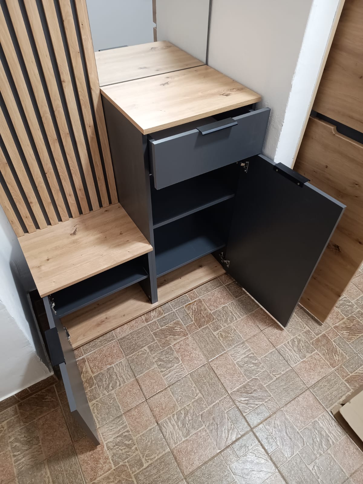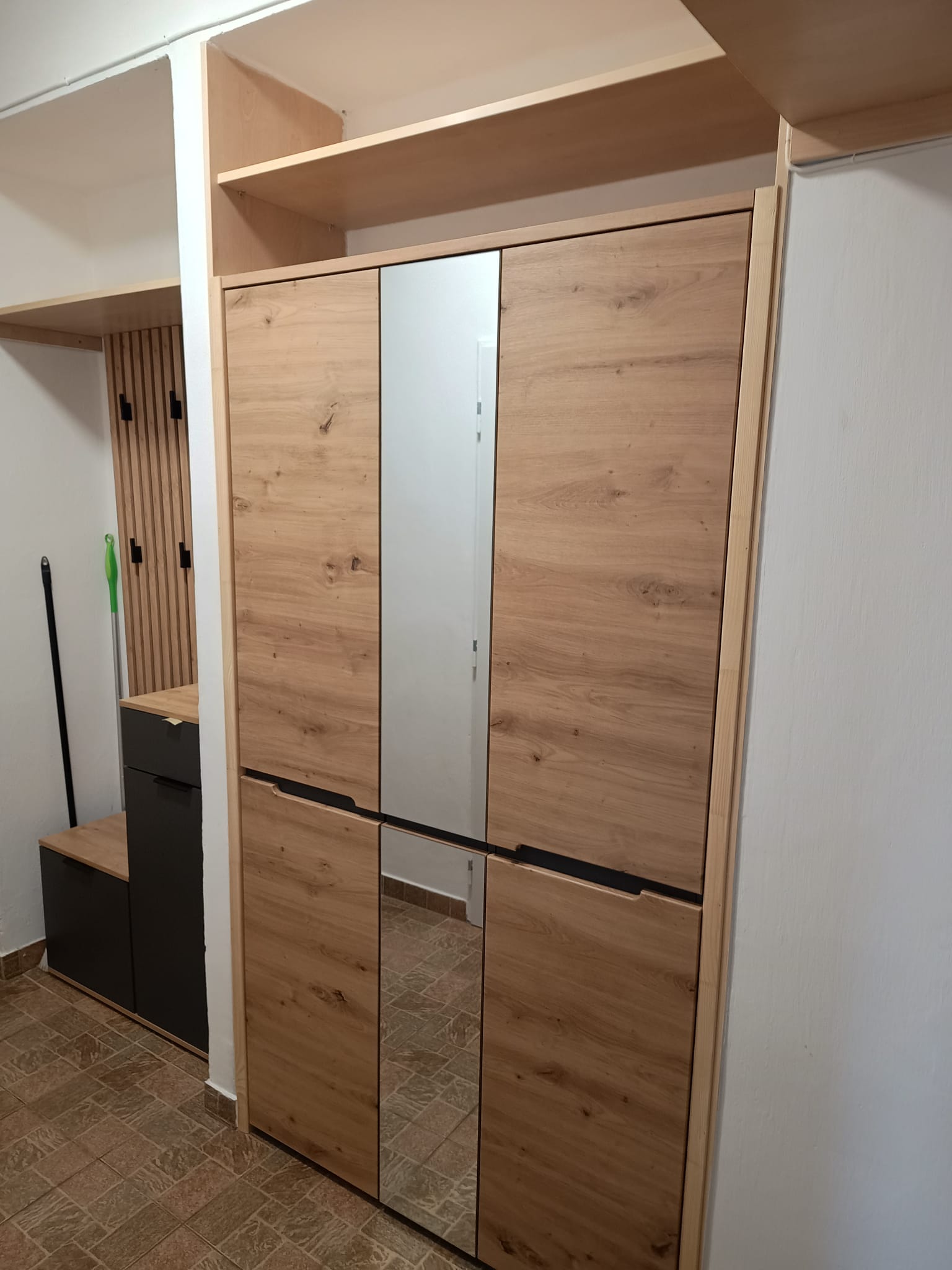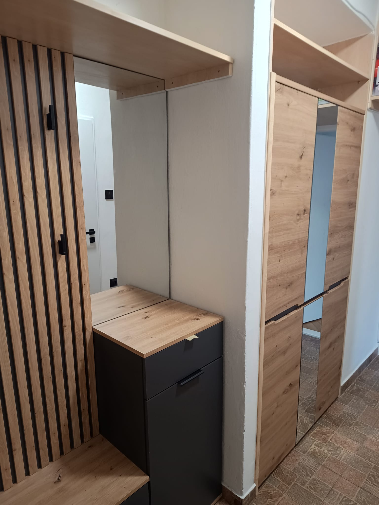 Byt se skládá z prostorné světlé předsíně, ze kterých jsou vstupy do oddělené koupelny a samostatného WC. Kuchyňský kout v šedém dekoru je vybavený moderní lednicí od značky Samsung, digestoří, plynovým sporákem s elektrickou troubou a pračkosušičkou. V kuchyni je dostatek úložného prostoru a také světla. V bytě se nachází dvě ložnice. První ložnice je situována do ulice Kafkova a je vybavenou šedou skříní. Druhý prostornější pokoj je situovaný do klidného zeleného vnitrobloku. Pokoj je přepažený dřevěnou moderní polo příčkou, která odděluju šatnu od pokoje. V tomto pokoji jsou na stěnách nataženy krémové tapety. V bytě jsou všude nové bíle dveře, čerstvě vymalováno, sítě v oknech a také okenní žaluzie. Okna v bytě jsou moderní plastová. V pokojích jsou na podlaze dřevěné parkety, ve zbytku bytu je položena dlažba. Ohřev vody a vytápění bytu zajištuje centrální kotel domu.
